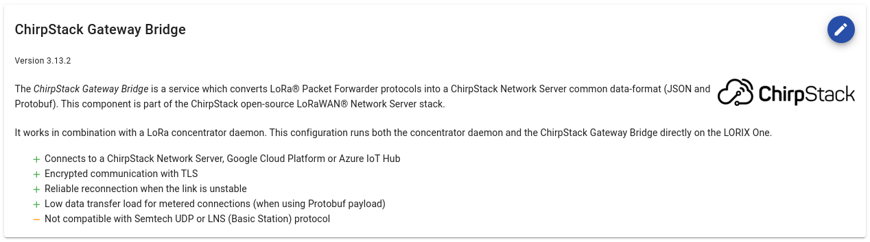 - On the LoRa > Forwarder page, use the top right edit button.