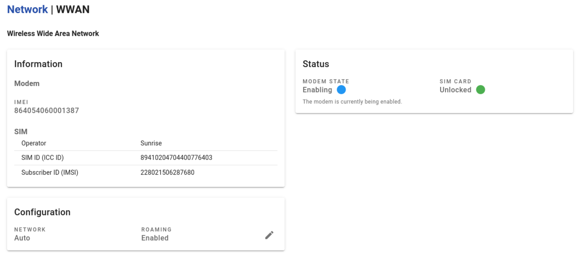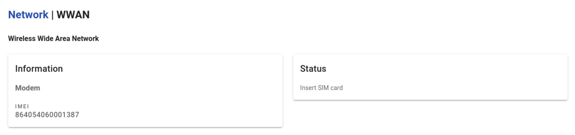 If no SIM card is inserted, you will get the following page, showing the modem IMEI and asking for SIM insertion.