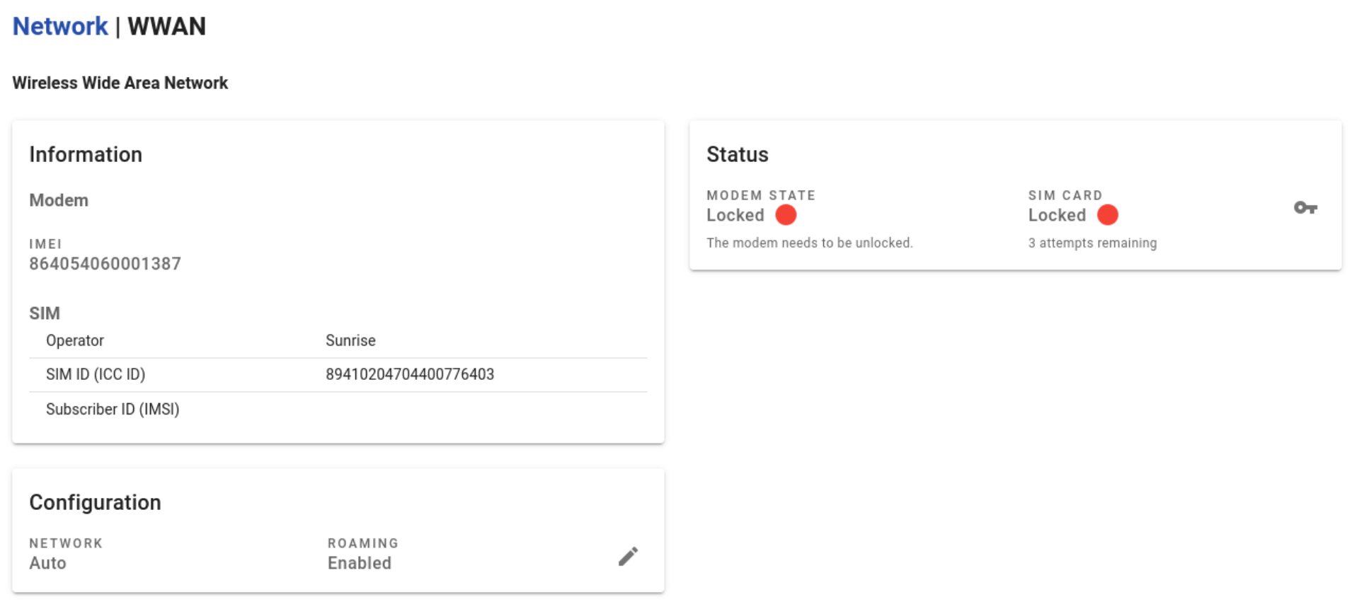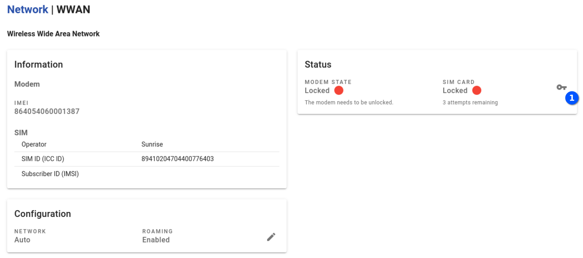 To unlock the SIM (and therefore the modem), click the "key" (1) button.