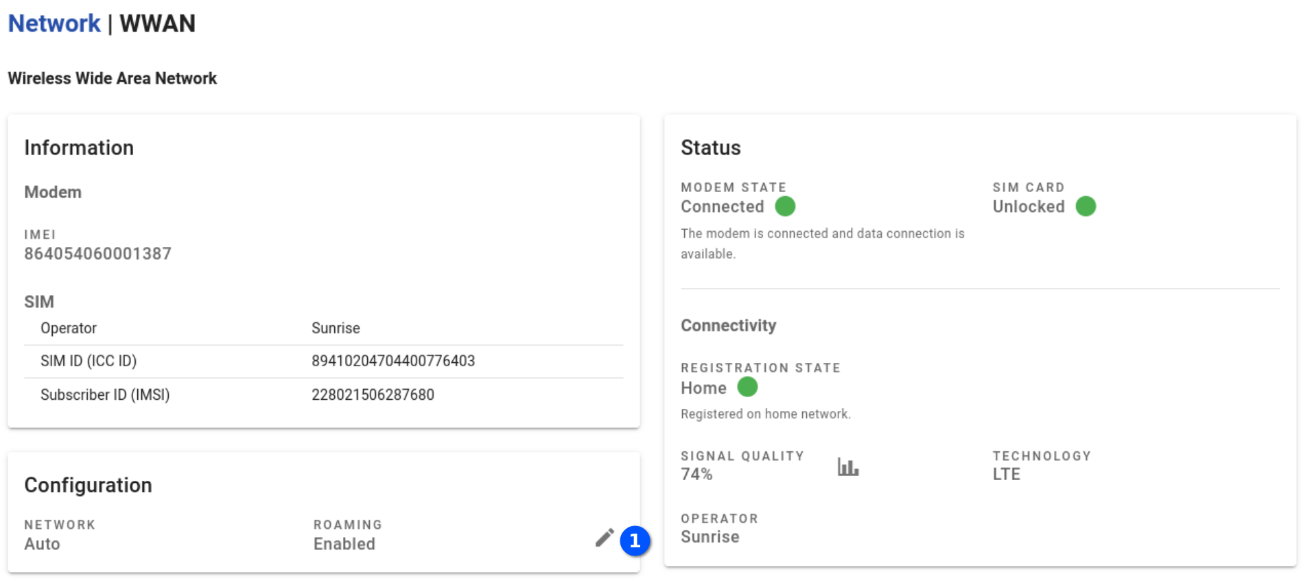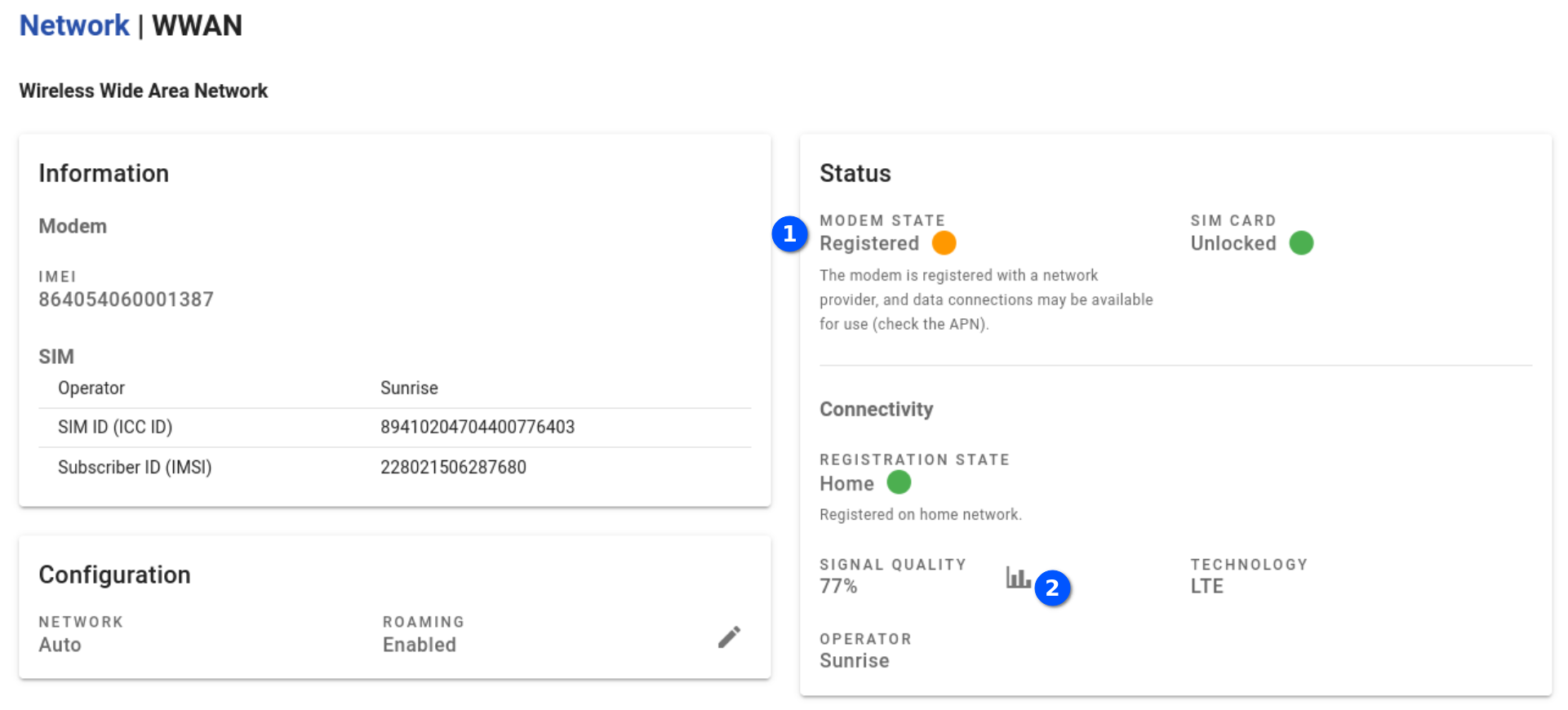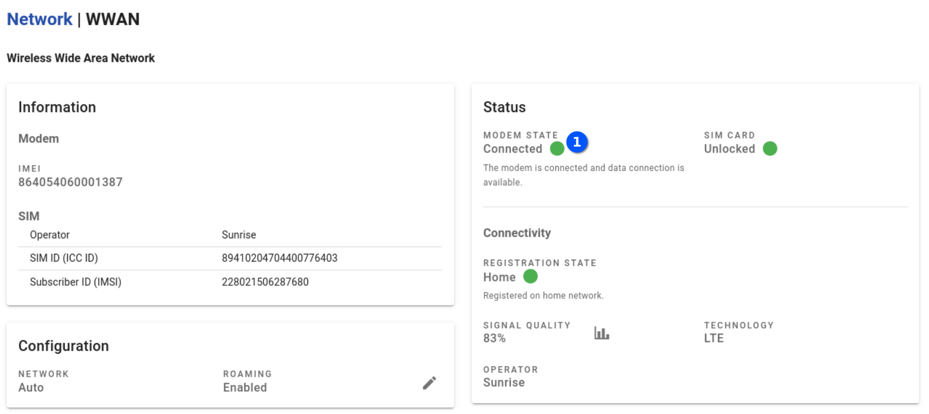 When in the "Registered" state (1), the modem is connected to a network cell of the operator. At this stage, it should however not yet be connected to the IP network, and thus not have any connection in the system.