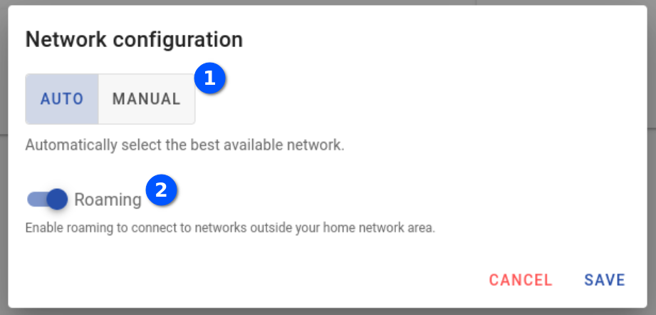 In Manual mode, you can either specify directly the Operator code (MNC/MCC code) to use (1) or scan the available networks (2).