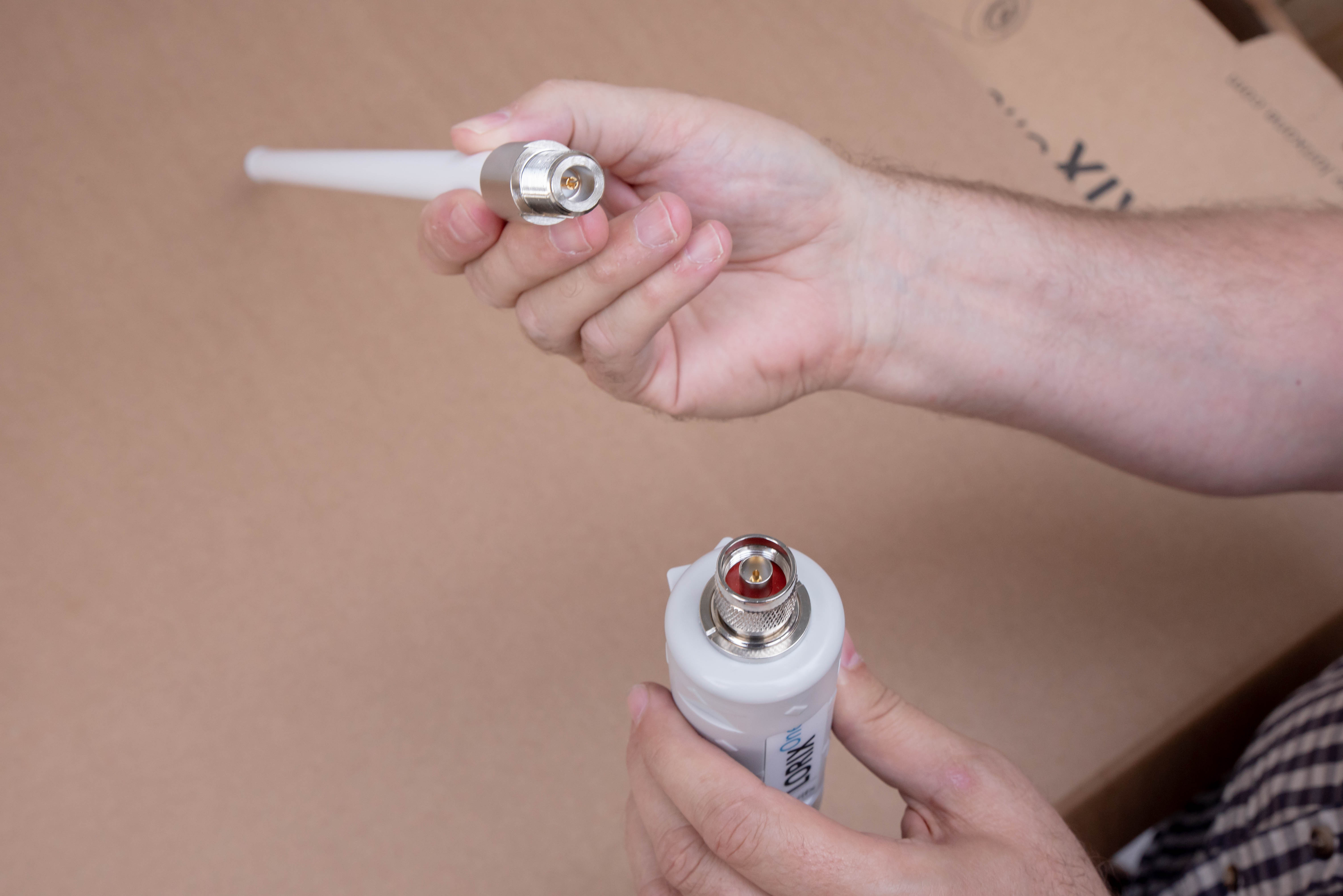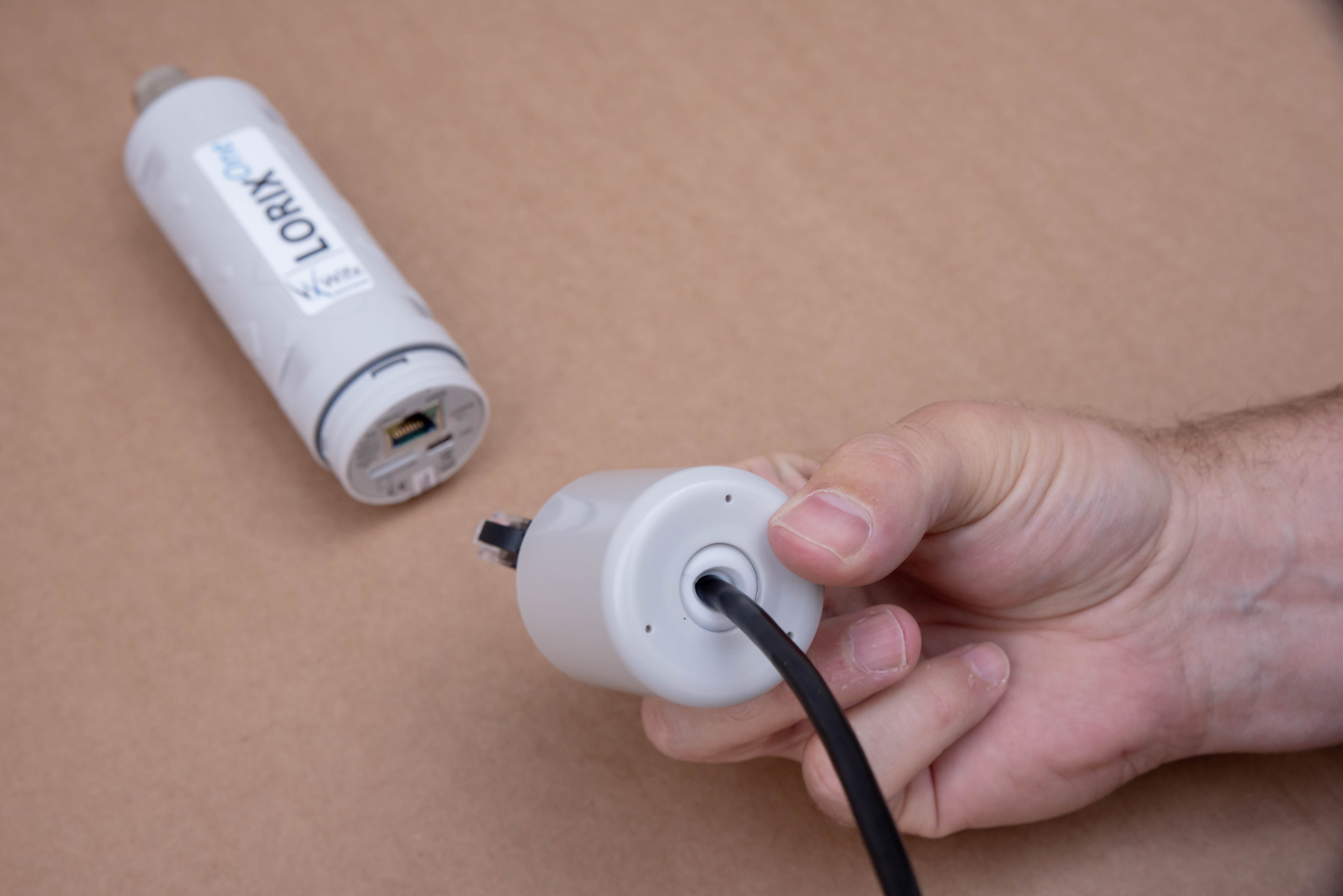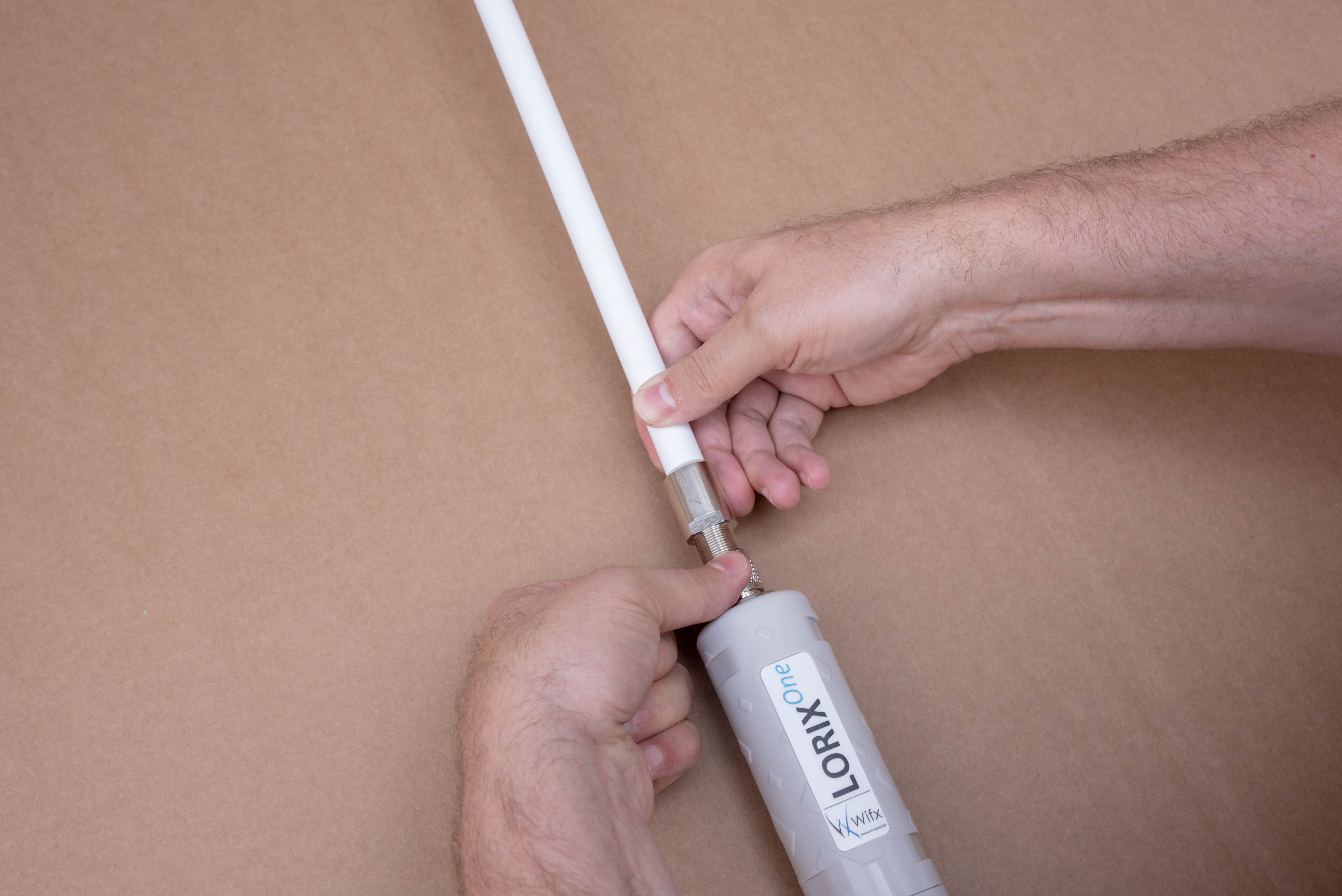 While maintaining the antenna into the gateway, start screwing with the other hand the gateway RF connector tightening ring.