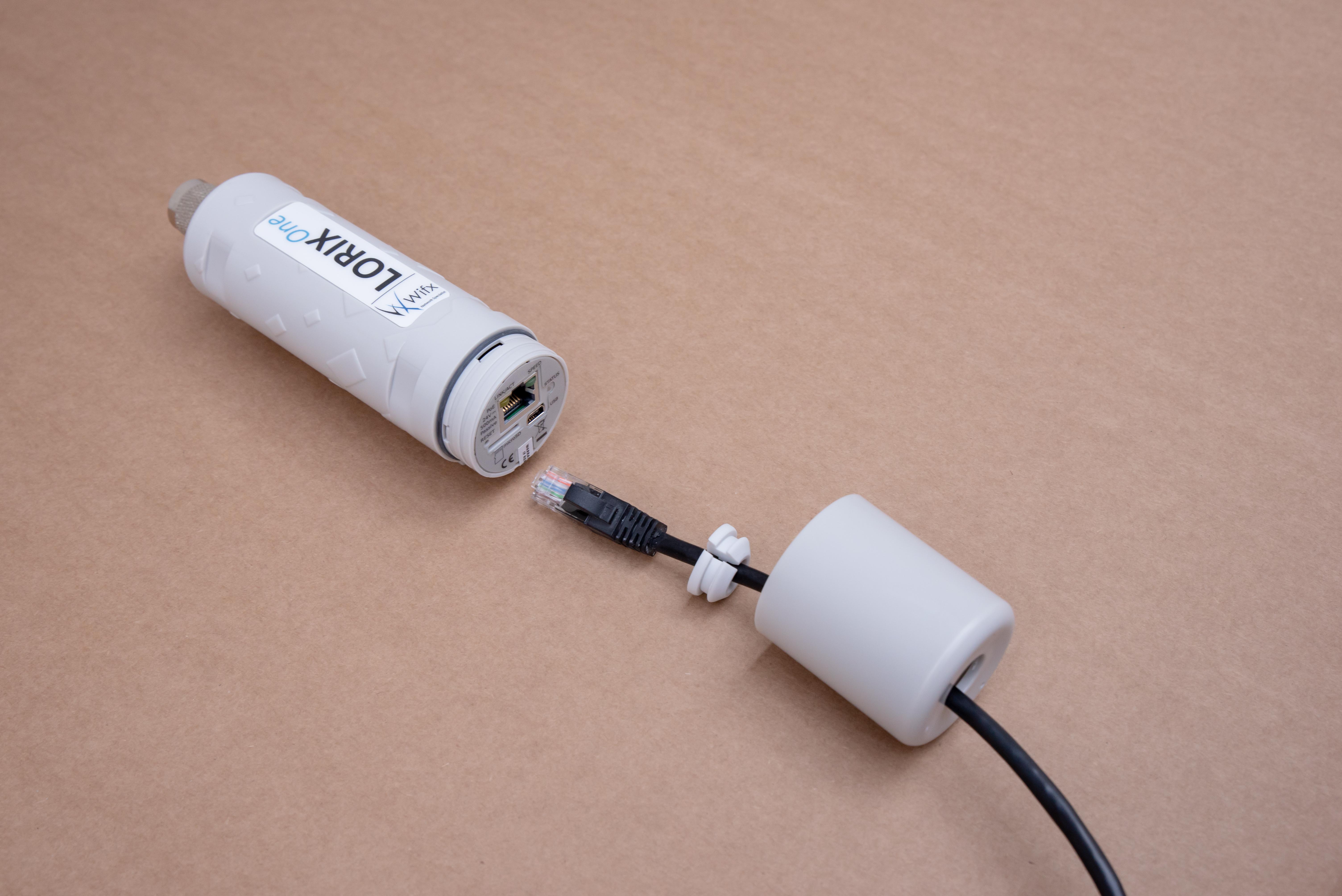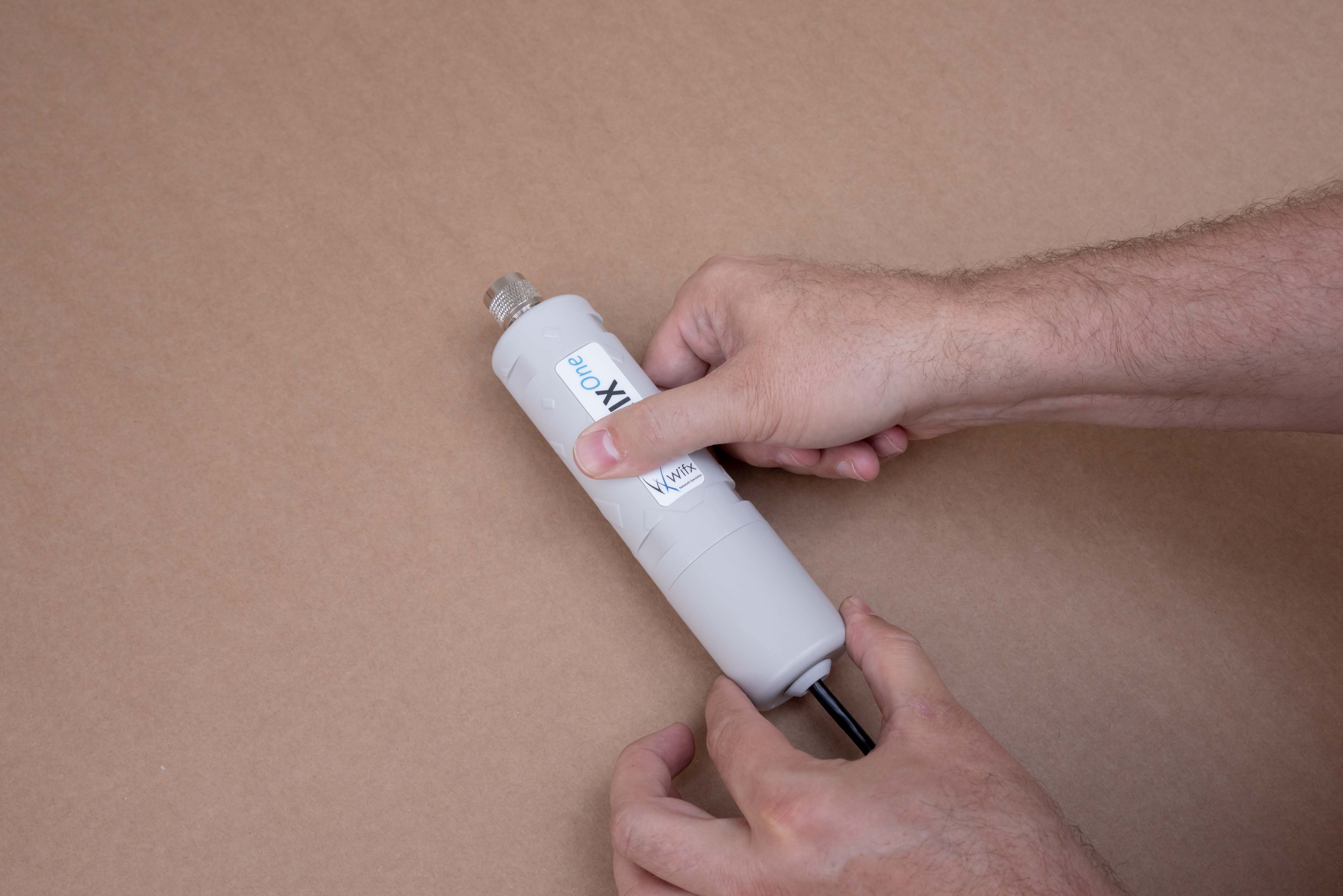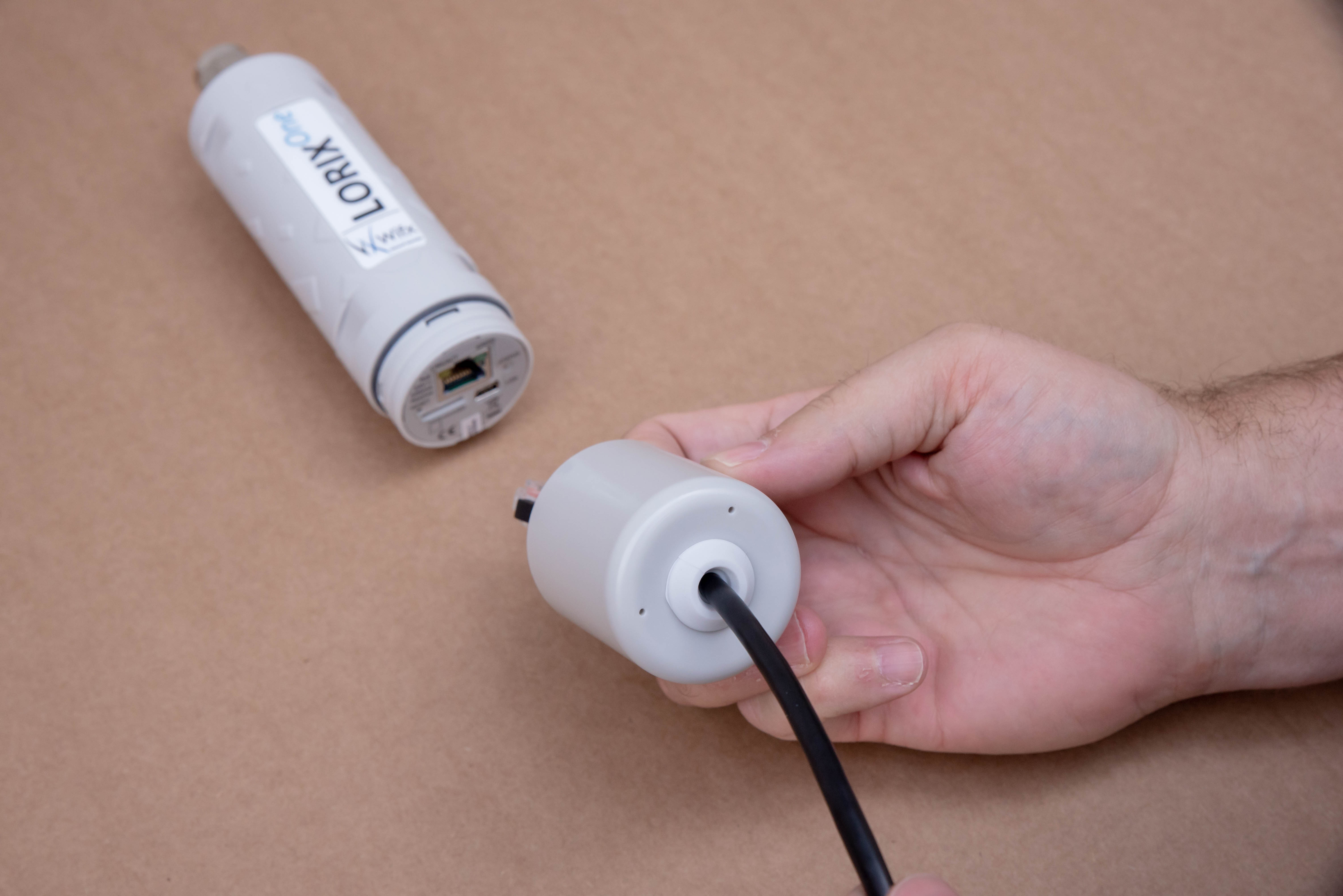 While maintaining the antenna into the gateway, start screwing with the other hand the gateway RF connector tightening ring.