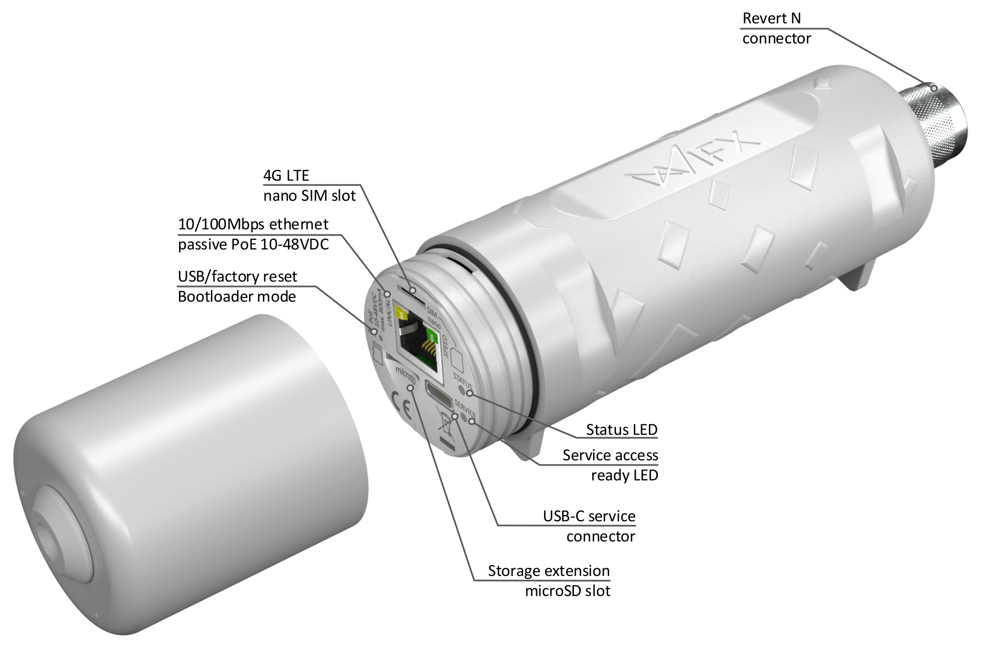 Wifx L1 4G Setup Current: Prepare the gateway Prepare the gateway Gateway overviewTurn the gateway onThe power is injected through a PoE injector as shown below: If you invert the switch and gateway side, the gateway will not be powered and the switch may get damaged. Power must be injected in the power input connector using the switching power supply provided with the LORIX One only:ReferenceHNP12-240L6Output voltage24VDCOutput current500mA The gateway must never be switched on without a compatible antenna being connected to the Waterproof N connector.When no antenna is connected, the impedance matching to the RF interface is incorrect and may damage the gateway. ×